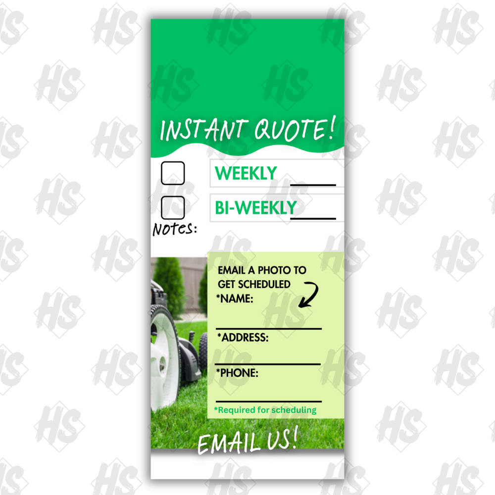 Door hangers are a fantastic way to advertise to your local community. Our designs are made to focus on simple design and easy sales. When going door to door, you might as well leave your potential customers with a price. The potential customer just has to fill out their information on the back and email or text you a photo, making getting new customers on your schedule fast and easy!
